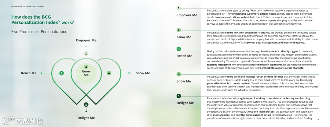 为实现这种差异化,领先企业致力于兑现五个客户承诺:了解我、触达我、展示我、愉悦我及赋能我。该框架构成了客户期望的核心,是企业制定个性化战略并进行数据应用的基础蓝图,旨在系统性地优化客户体验。