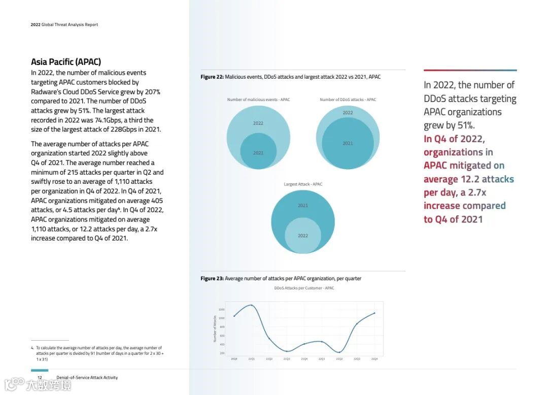 分布式拒绝服务(DDoS)攻击多年来一直是一种常见且不断增长的威胁,给组织造成了重大破坏。Radware的云DDoS服务拦截的恶意事件与去年相比增长了233%,DDoS攻击的数量增长了150%。总攻击量达到4.44PB字节,比2021年增长32%。