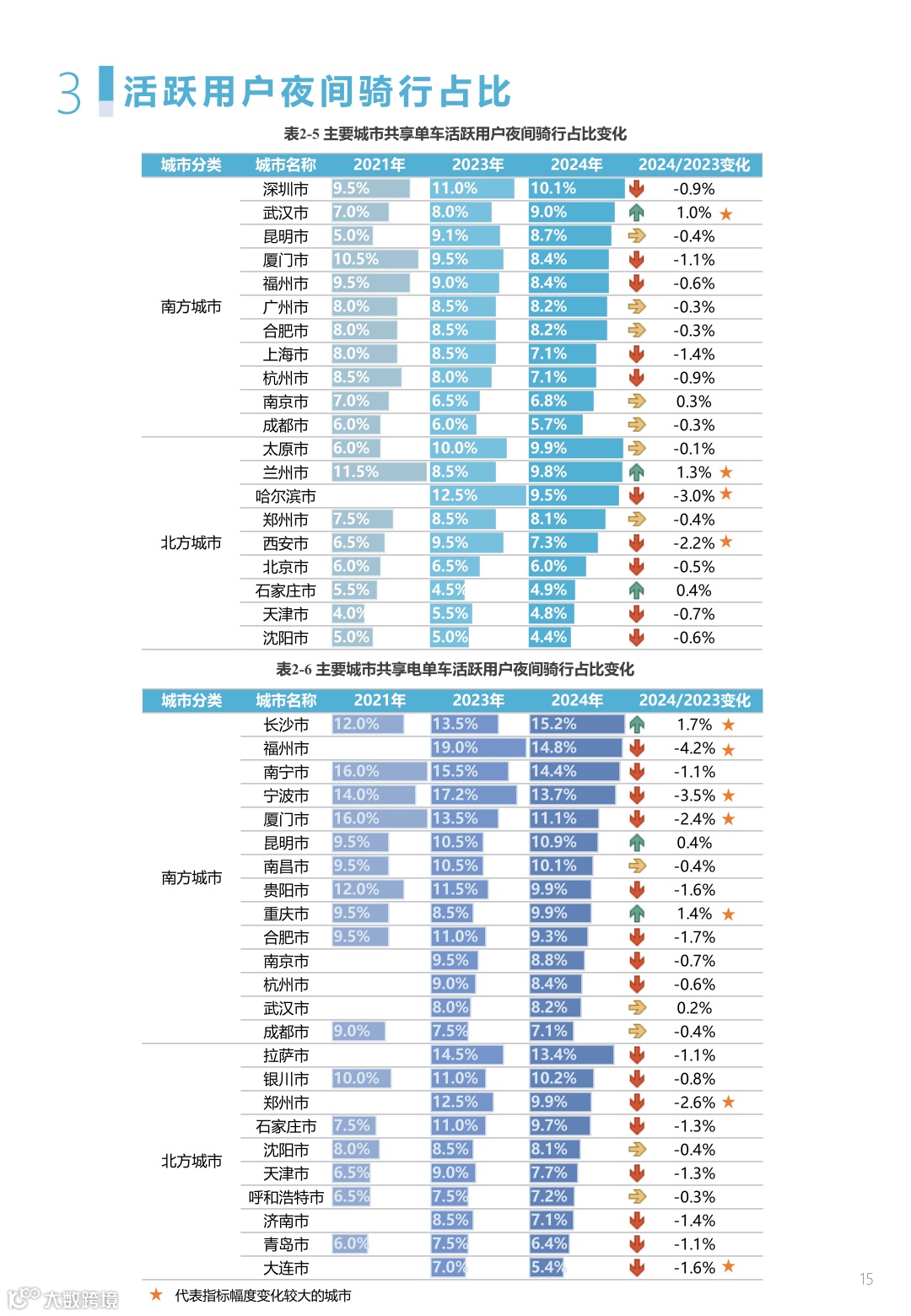 相较2023年,2024年报告进行了指标优化调整。活力骑行新增活跃用户周末骑行次数指标,突 出关注多元化骑行目的特征演变;轨道骑行新增轨道周边骑行订单占比指标,跟踪“轨道+骑行”一体 化出行特征演变;便捷骑行新增停放点位服务通勤占比指标,反映共享骑行服务供给与出行需求的 匹配程度,引导共享骑行发展从强调设施覆盖到精准人群服务。
