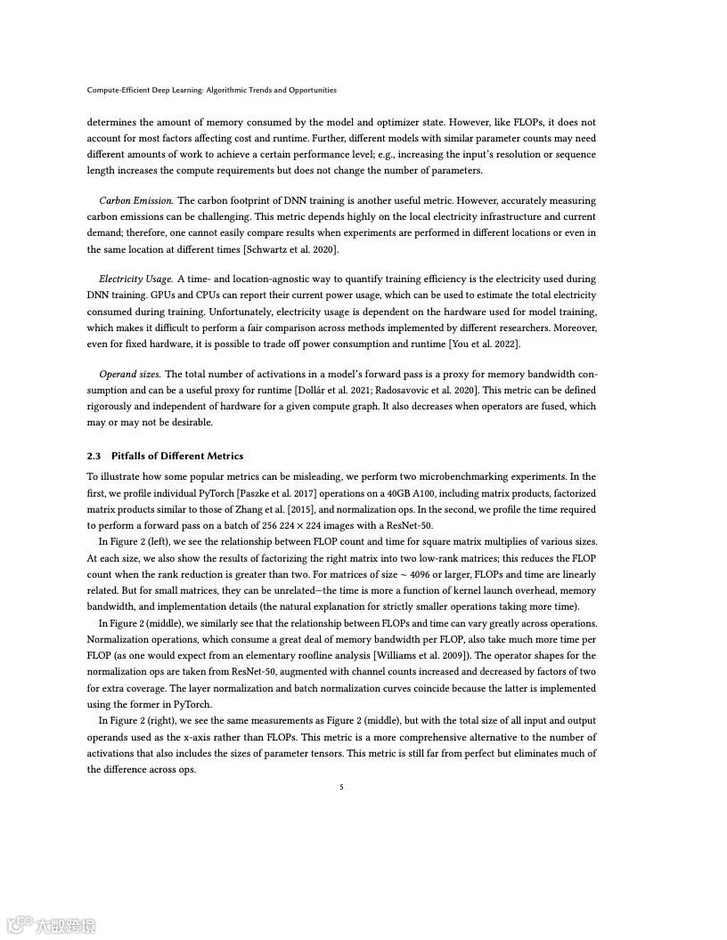 尽管扩大DL模型正在实现前所未有的进步,但训练大型模型已经变得极其昂贵。例如,GPT-3训练成本估计为165万美元,使用谷歌v3 TPU[Lohn和Musser 2022],且transformer 模型的低效/幼稚开发将产生相当于5辆汽车终生碳足迹的二氧化碳(CO2) [Strubell等人,2019]。值得关注的是,DL仍然没有达到许多应用所要求的性能水平:例如,在现实世界中部署全自动驾驶汽车需要人类水平的性能,但还没有达到。不断增长的模型和数据规模以达到所需的性能将使当前的训练策略在金融、环境和其他方面不可持续。事实上,根据目前的趋势推断,2026年最大的人工智能模型的训练成本将超过美国的GDP总量(Lohn and Musser 2022)。此外,DL对计算的高度依赖引发了人们对财务资源有限的用户(如学者、学生和研究人员(特别是来自新兴经济体的人)的边缘化的担忧[Ahmed and Wahed 2020]。我们将在附录A中更详细地讨论这些关键问题。