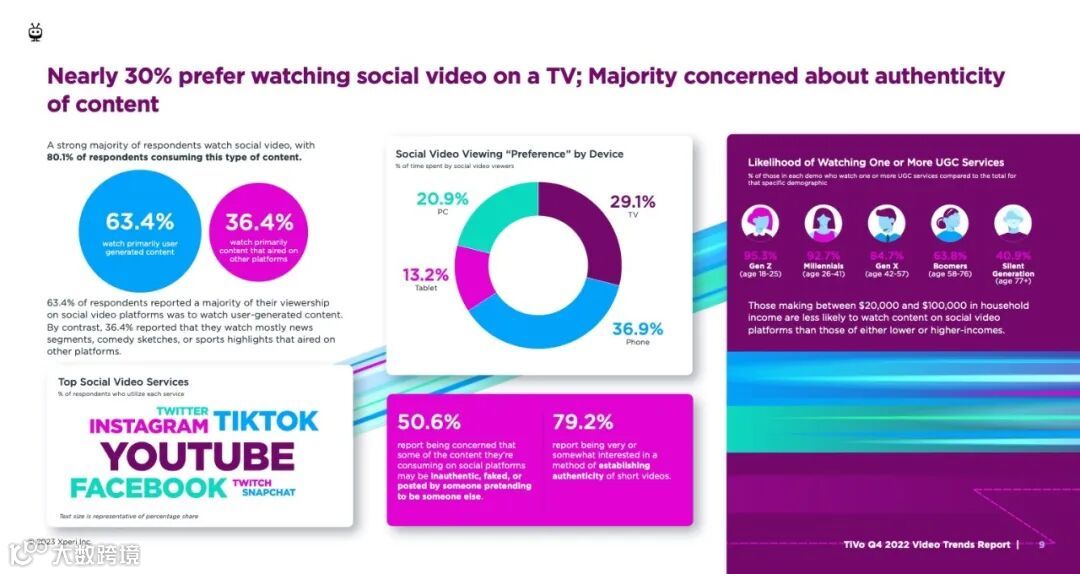 2022年第四季度消费者平均使用近12项(11.6项)服务来收看视频内容,高于一年前的8.9项,使用的非付费服务数量从2.4项增加到3.9项。