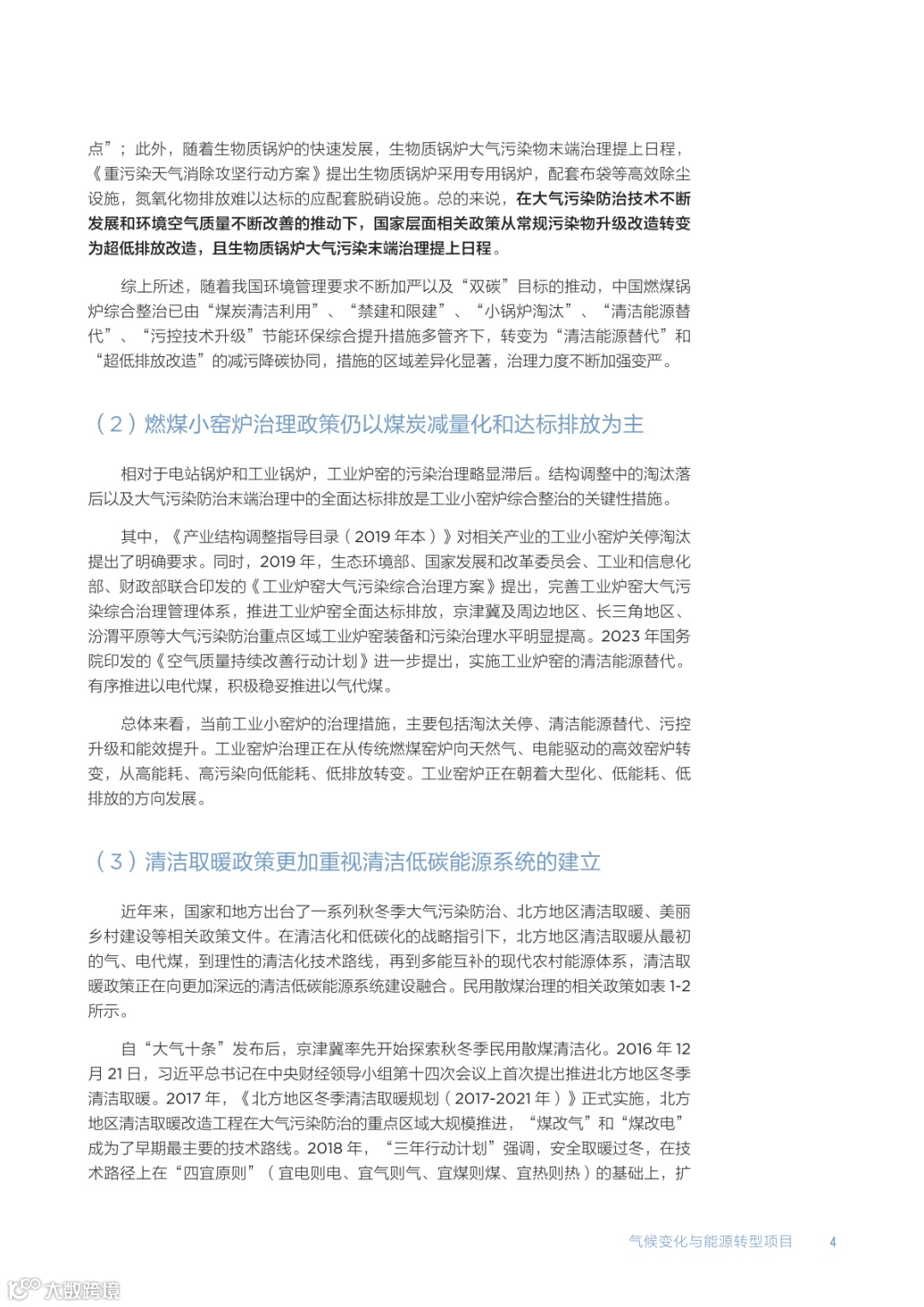 2023 年是散煤综合治理稳中求进的一年。工业散煤治理在煤炭减量、清洁替代与 污控升级等方面持续深入,工业小锅炉和小窑炉(建材行业)的散烧煤用量整体保持下 降趋势。民用散煤治理在热源清洁和低碳化方面更加务实,北方地区清洁取暖率提升了 一个百分点,在农村地区累计完成 3900 万户的清洁取暖改造,虽然农村建筑能效提升 进展低于预期,但农村居民对节能降耗、清洁取暖的自主意识逐步加强,农村地区可再 生能源利用规模不断扩大,清洁取暖市场竞争格局以及新的业态正在形成。散煤治理的 诸多成效对环境质量改善,尤其是室内人体健康水平的提高,发挥重要作用并产生积极 效益。