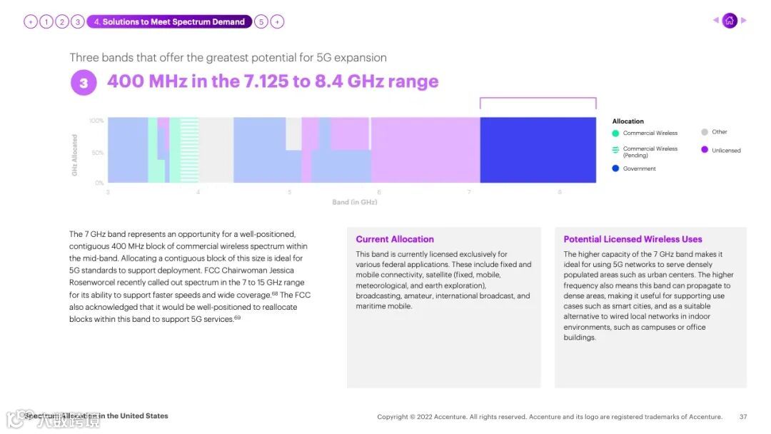 根据这项研究,美国无线行业目前可以使用5%的低中频频谱,而未经许可的频谱用户可以使用7倍的频谱,政府用户可以使用12倍的频谱。研究发现,以下三块较低的中频频谱为5G扩展提供了最大的潜力:
