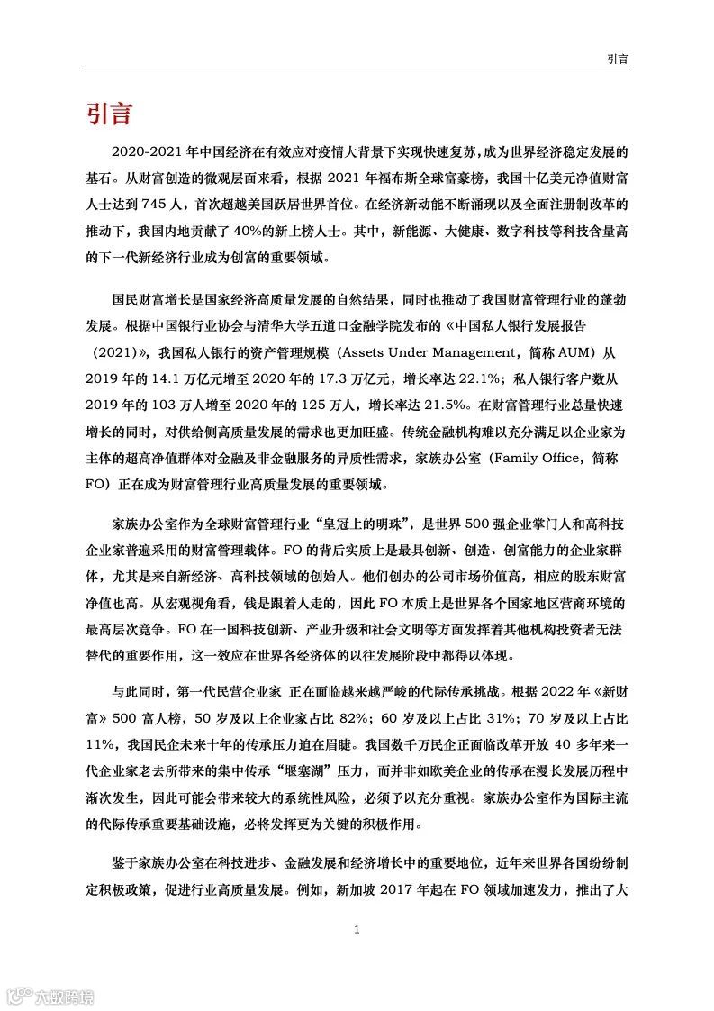 国民财富增长是国家经济高质量发展的自然结果,同时也推动了我国财富管理行业的蓬勃发展。根据中国银行业协会与清华大学五道口金融学院发布的《中国私人银行发展报告(2021)》,我国私人银行的资产管理规模(Assets Under Management,简称 AUM)从2019 年的 14.1 万亿元增至 2020 年的 17.3 万亿元,增长率达 22.1%;私人银行客户数从2019 年的 103 万人增至 2020 年的 125 万人,增长率达 21.5%。在财富管理行业总量快速增长的同时,对供给侧高质量发展的需求也更加旺盛。传统金融机构难以充分满足以企业家为主体的超高净值群体对金融及非金融服务的异质性需求,家族办公室(Family Office,简称FO)正在成为财富管理行业高质量发展的重要领域。