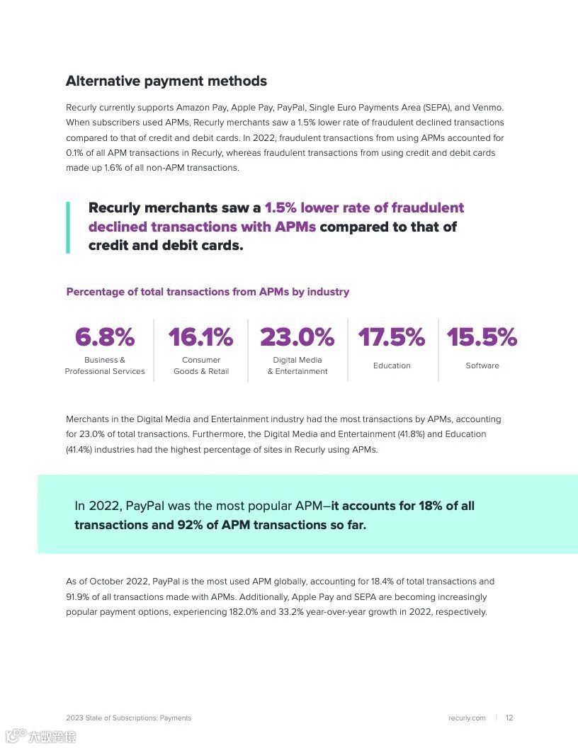 在替代支付方式(APM)中,亚马逊的递减率最高(7.9%),其次是SEPA(7.5%)、Apple Pay(7%)和PayPal(5.7%)。APM使用率在数字媒体和娱乐行业最高(23%),在商业和专业服务行业最低(6.8%)。