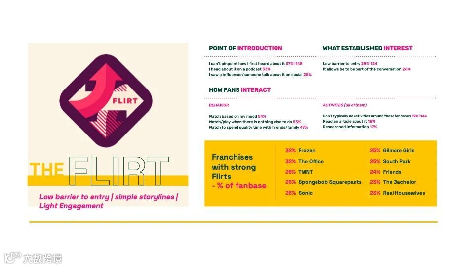 参与度最低的受众,但对推动整体收视率仍然起到重要作用;他们听说过某个节目、电影、游戏,并且会 “把它添加到列表中”,但只会在有心情时才会观看或游玩;他们只是因为“其他人都在看”而观看或游玩。