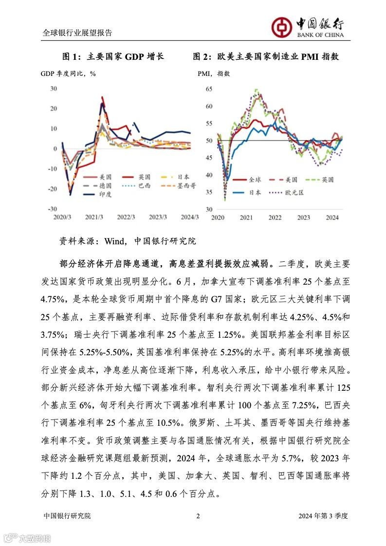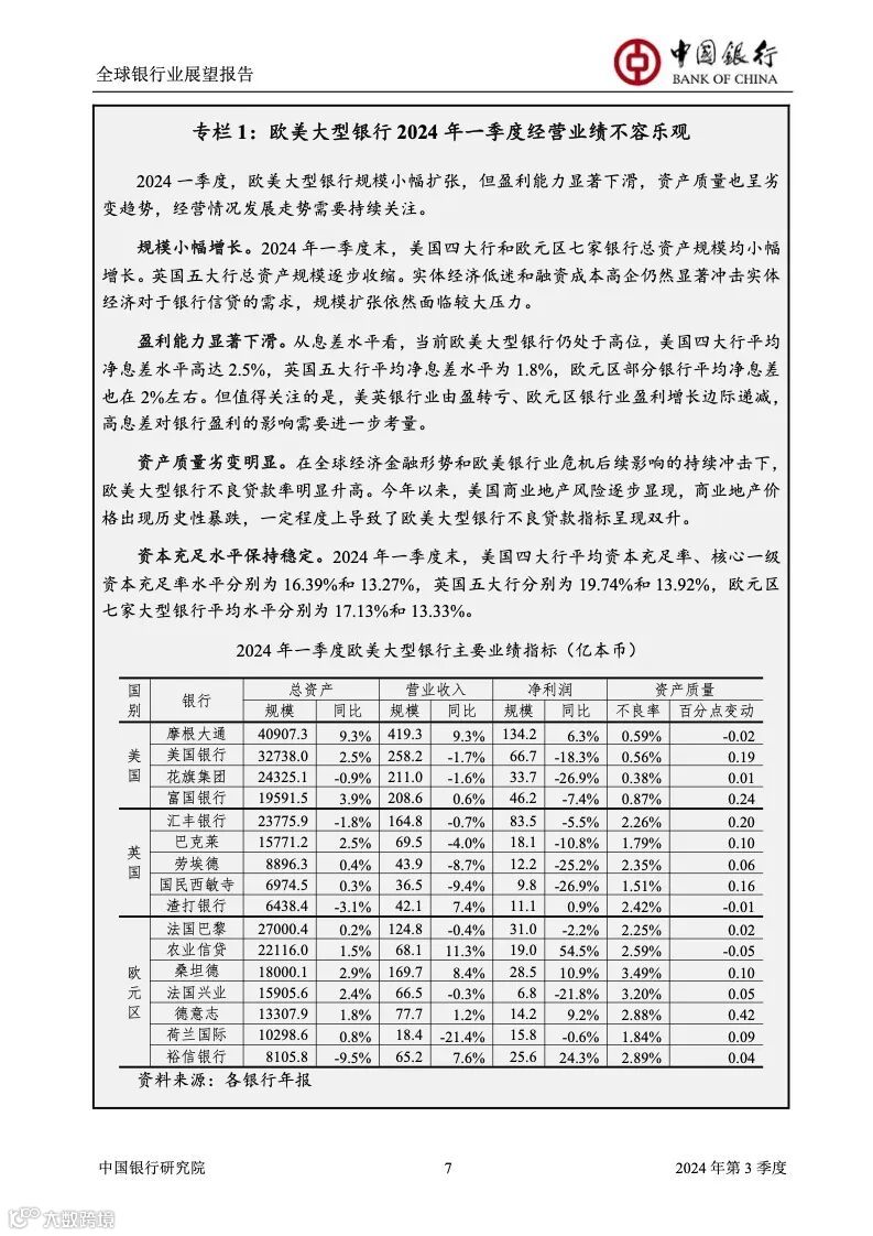 2024 年三季度,全球银行业将继续面临高利率环境, 盈利能力全面下滑,规模扩张速度放缓,重点领域信用 风险爆发,资产质量下行压力增加,强监管带来更大资 本补充压力。