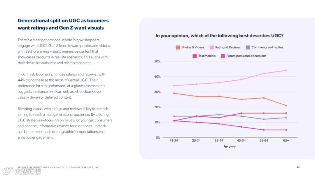 与此同时,不仅仅网红有影响力:用户生成内容(UGC)在购买过程中也起着关键作用,尤其是对年轻购物者来说。65%的受访者认为UGC很重要,这一比例在18-24岁的受访者中升至80%,在25-34岁的受访者中升至76%。