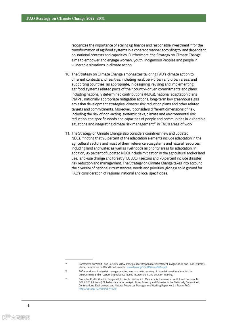 《气候变化战略》于2022年6月获得粮农组织理事会的批准,旨在促进具有更强适应性和抵御力的低碳经济,推动相关解决方案的公众认知、采纳,并吸引投资;“与此同时,提供健康膳食所需的充足、安全和营养食品,并提供其他农产品和服务,造福当代和后代人类,不让任何人掉队”。