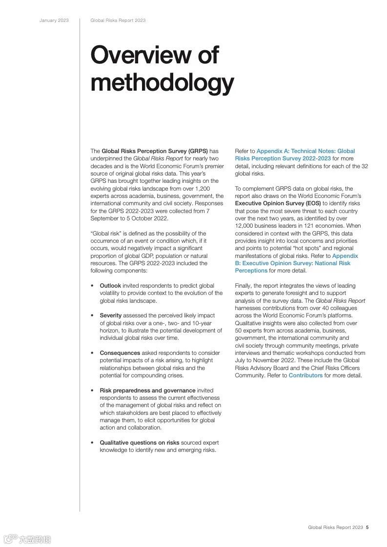 上述结论源自今日发布的《2023年全球风险报告》。报告指出,针对最严重的长期威胁的行动窗口正在快速关闭,因此在各项风险到达临界点之前,国际社会需要开展集体行动。