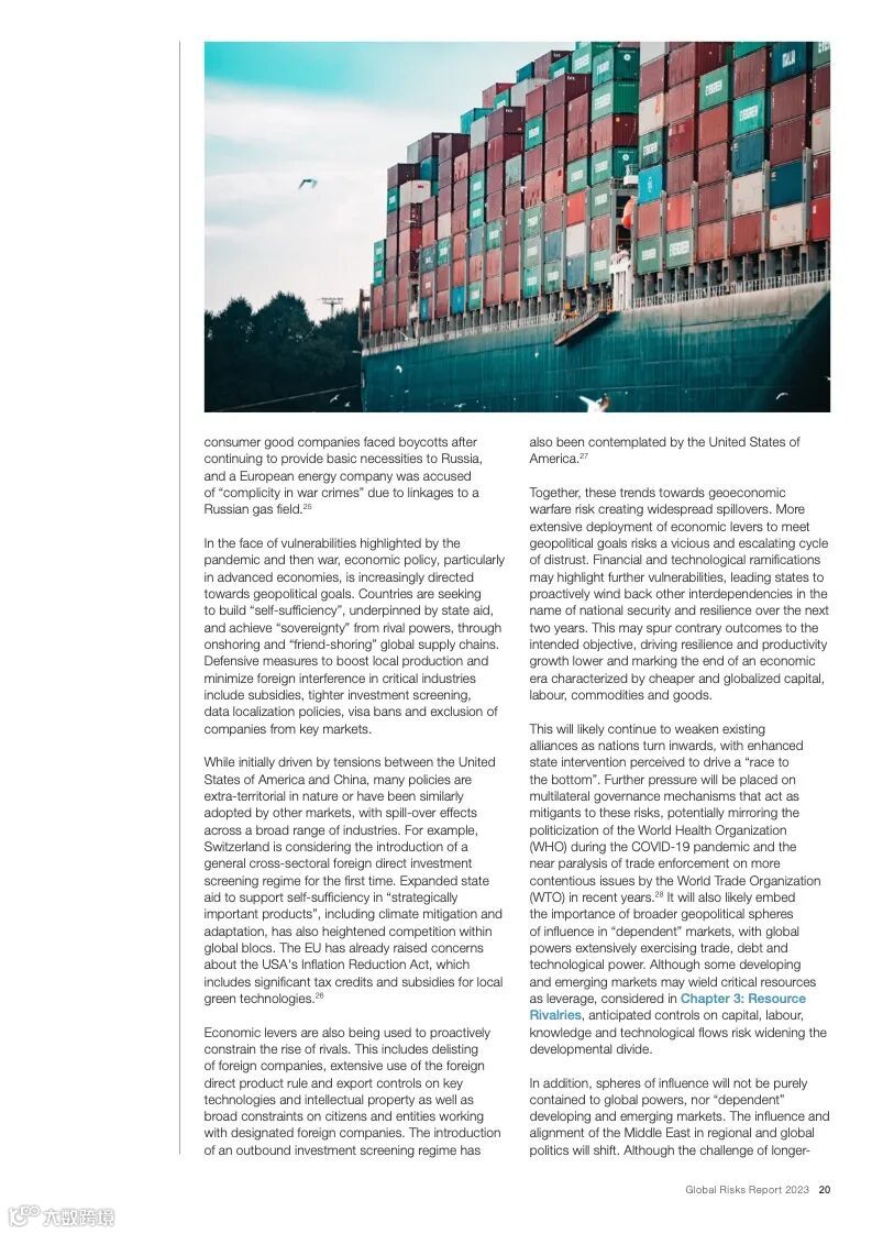 当前,在全球新冠疫情和欧洲战争的影响下,能源、通货膨胀、粮食和安全危机重新成为焦点。在这些危机的推动下,下列后续风险将主导未来两年的风险格局:经济衰退风险、日益严重的债务困境、持续发酵的生活成本危机、错误信息和虚假信息导致的社会极化趋势、快速气候行动的中断以及零和博弈的地缘经济战争。