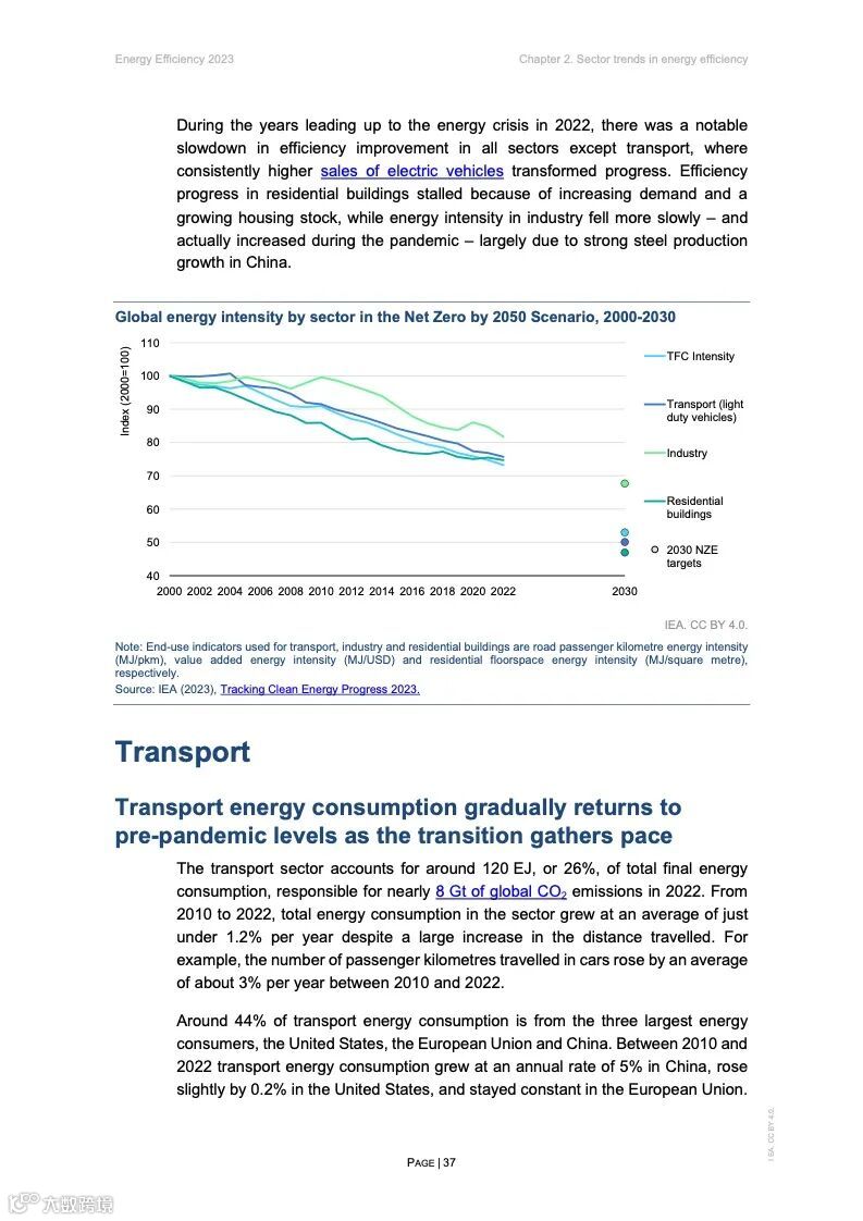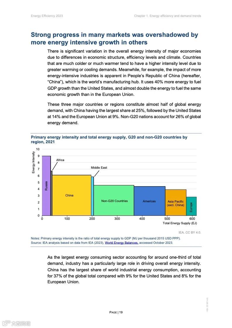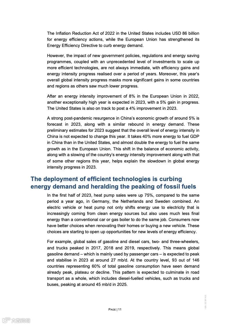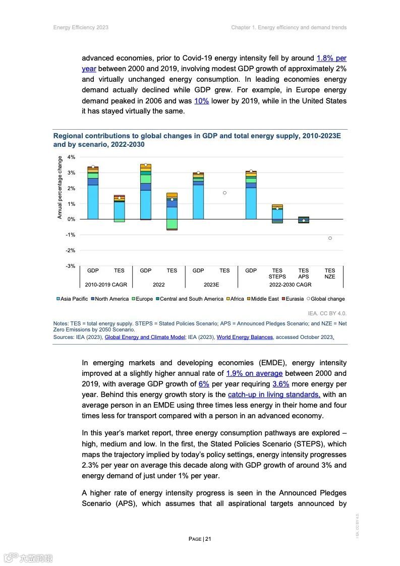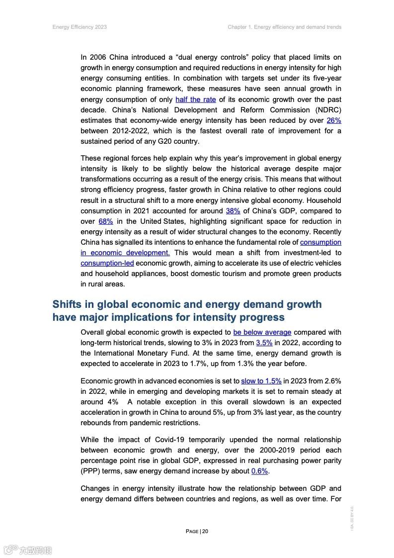 国际能源署发布了“2023年能源效率报告”。效率政策势头增强,但全球能源强度进展放缓。预计2023年全球能源强度(衡量全球经济能源效率的主要指标)的增长速度将回落至1.3%,低于较长期趋势水平。较低的能源强度改善率在很大程度上反映了2023年能源需求增长1.7%,而去年同期为1.3%。