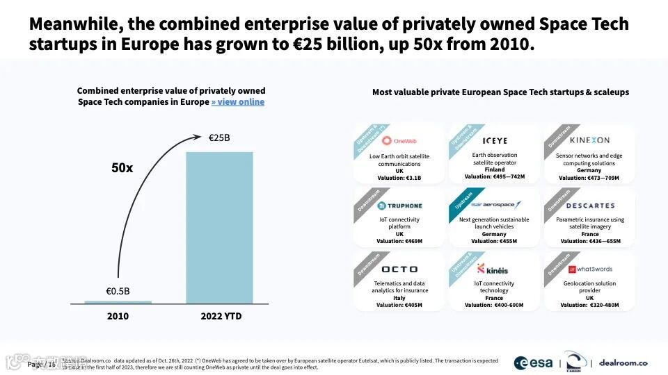 欧洲空间科技创业生态系统现在的总价值为 250亿美元,几乎所有这些都是在过去十年实现的。