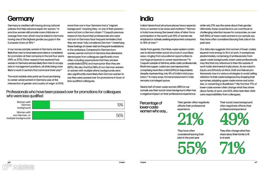 自Coqual开始研究职场性别不平等现象以来的近20年里,大量报告都表明,女性寻求平等地位是多么具有挑战性。虽然有些情况确实有所好转,但本报告中的数据有助于理解世界各地仍然存在的持续不平等模式。Coqual批判性地探讨了澳大利亚巴西德国、印度、日本、南非、英国和美国职场的性别差异,这些国家都有性别不平等的共同特征,但在背景细微差别方面有所不同。