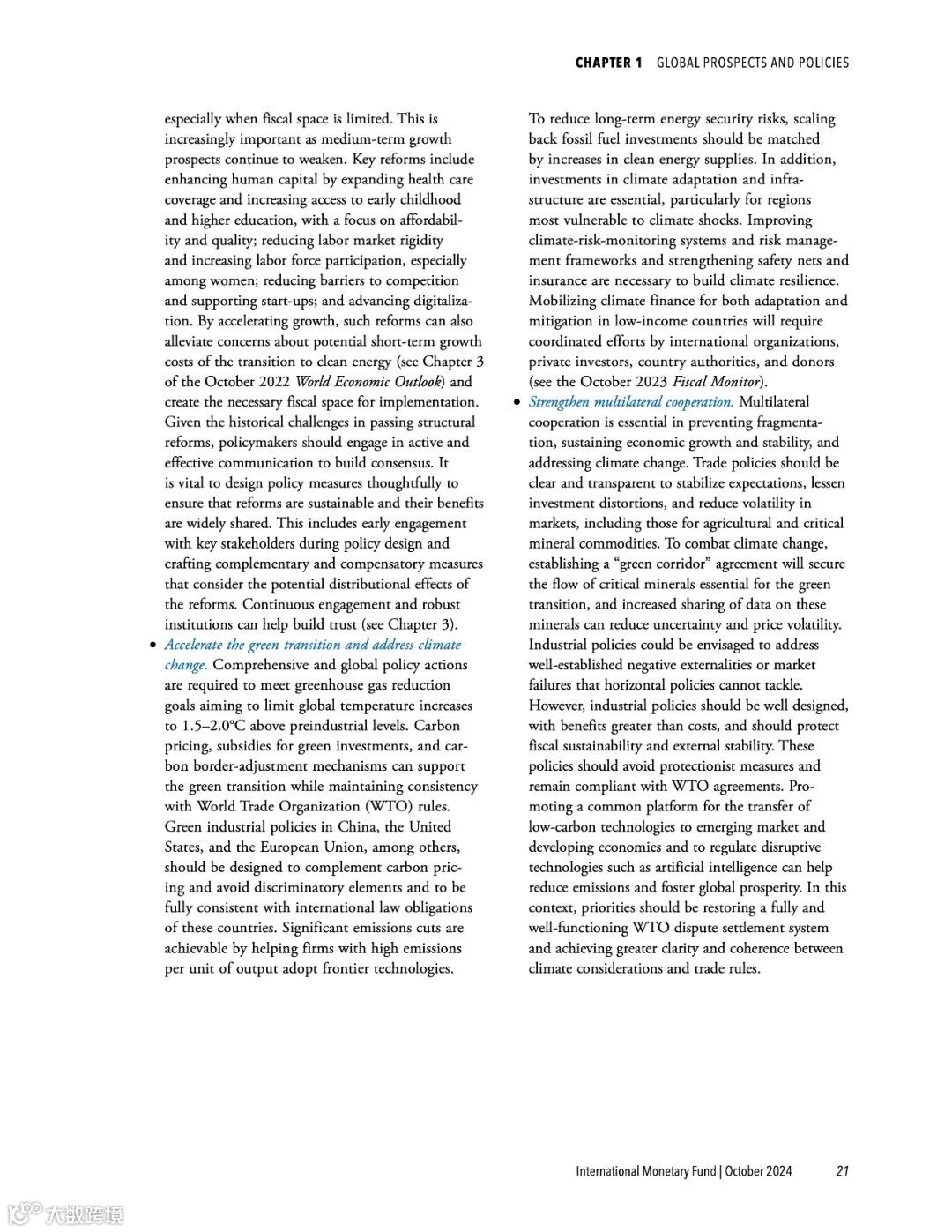 国际货币基金组织特别强调,全球多边合作是解决当前全球性挑战的关键。无论是加速绿色转型、应对气候变化,还是推动债务重组和实现全球经济增长,多边框架和基于规则的国际合作至关重要。