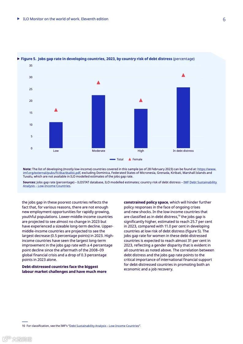 对于发展中国家来说,不断上升的债务水平增加了额外的挑战,大大缩小了政策干预的范围。金融和财政限制阻碍了对复杂威胁的回应,包括冲突、自然灾害和经济危机,这些危机往往会自我强化(多重危机),从而加剧就业差距。根据该报告,受债务困扰的低收入发展中国家面临的就业差距明显增大,2023年将达到25.7%,而受债务困扰风险较低的发展中国家则为11%。