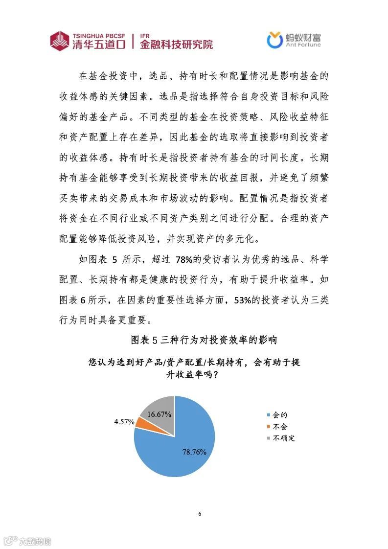 超过 78%的受访者认为优秀的选品、科学配置、长期持有都是健康的投资行为,有助于提升收益率。在因素的重要性选择方面,53%的投资者认为三类 行为同时具备更重要。