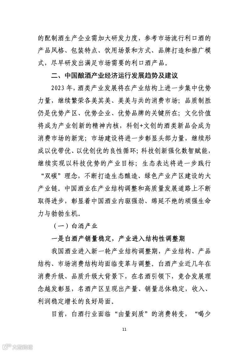 从经济指标看,白酒产业保持了较高的效益增长。纵观全年,头部名酒企业基本保持两位数增长,是白酒产业经济增长的主要动力。优势资源和品牌资源向优质产区和名酒企业聚集的趋势愈发明显,中小酒企面临的压力持续加大,区域酒企有机会,更有挑战。 从产能看,“十三五”时期的白酒产量高峰 1358 万千升,到今天的 671 万千升,白酒总产量不断下降,说明产业 存在产能过剩压力,加之横向竞争、健康消费观念带动的消 费结构变化,白酒产能未来仍有下降空间。盘活优质产能、 淘汰低效产能,成为白酒产业可持续发展的关键之一。