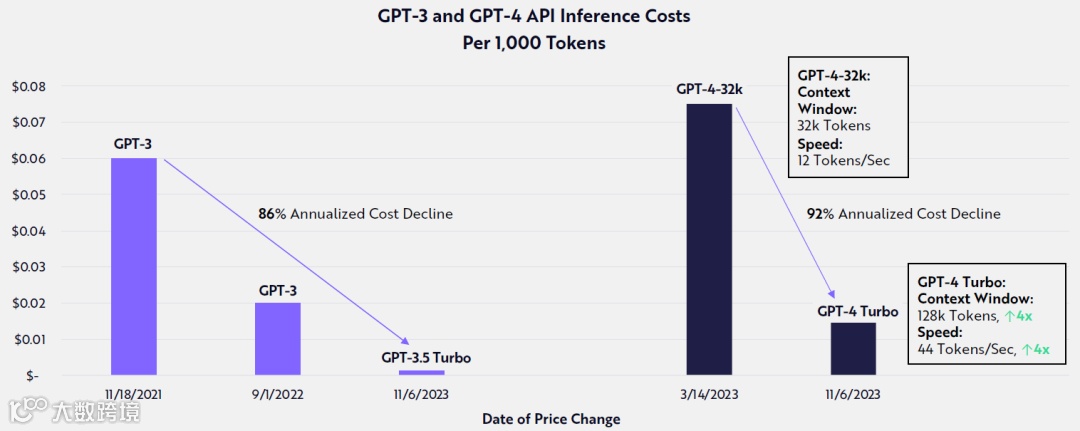 在最初专注于LLM培训成本优化后,研究人员现在将推理成本放在首位。根据企业规模的使用案例,推理成本似乎以每年约86%的速度下降,甚至比培训成本下降得更快。如今,与一年前的GPT3相比,GPT4 Turbo的推理成本更低。