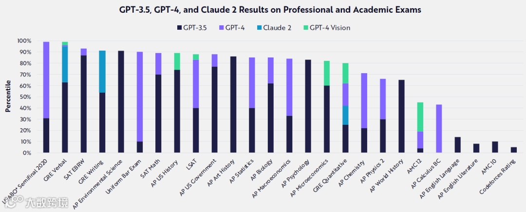 图:GPT-3.5, GPT-4, and Claude 2在各种考试中的结果