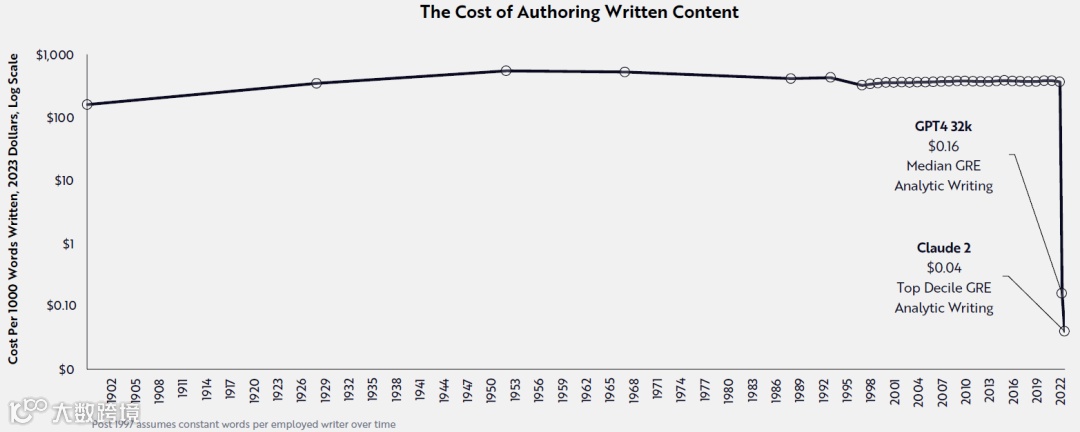 在过去的一个世纪里,撰写书面内容的成本在实际价值上一直相对稳定。然而,在过去两年中,随着LLM写作质量的提高,这一成本已经大幅下降。