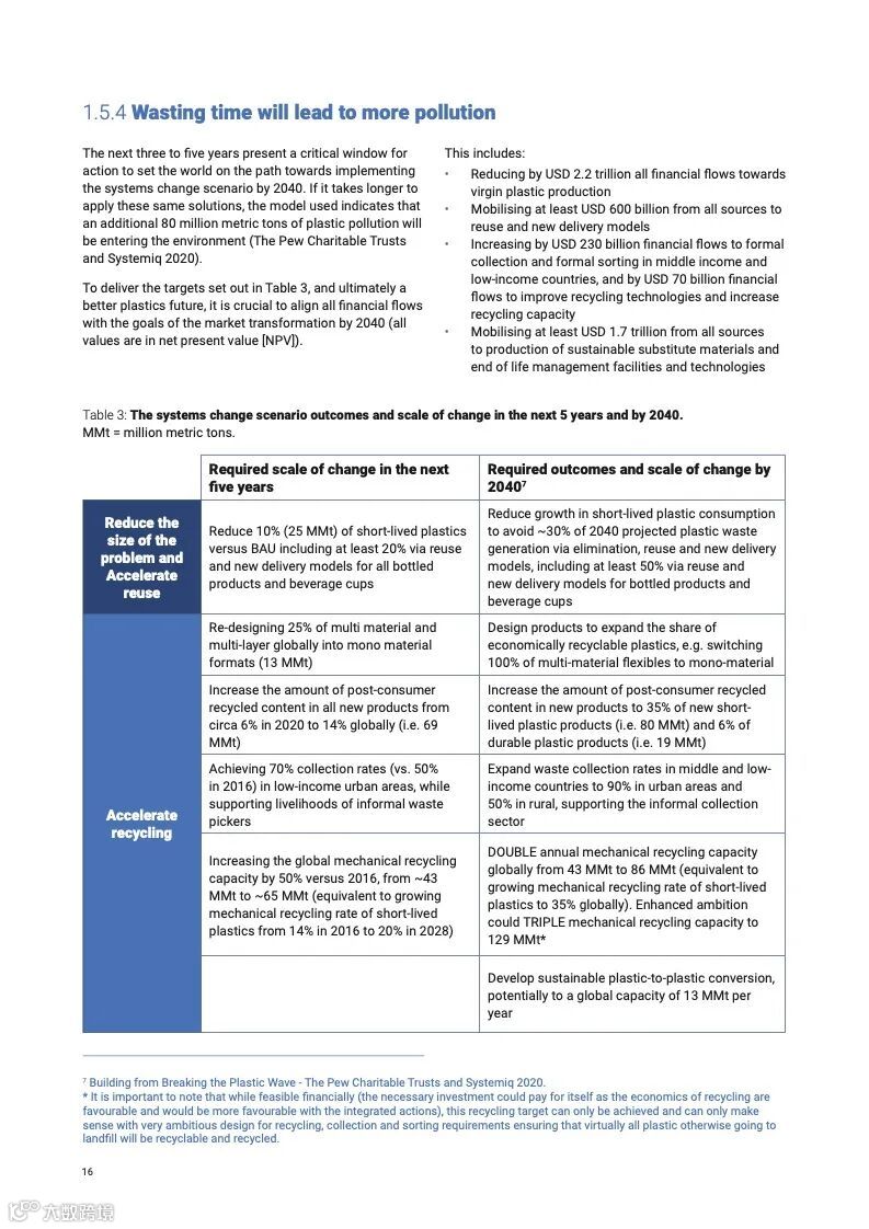 此外,本报告提议采取一种系统性变革,从成因上解决塑料污染,在减少问题最为严重、最不必要的塑料使用的同时进行市场转型,实现塑料循环。实现这一目标的途径在于:加速三大关键转变(重复利用、回收、调整定位与多样化),并采取行动,处理塑料污染的遗留问题。