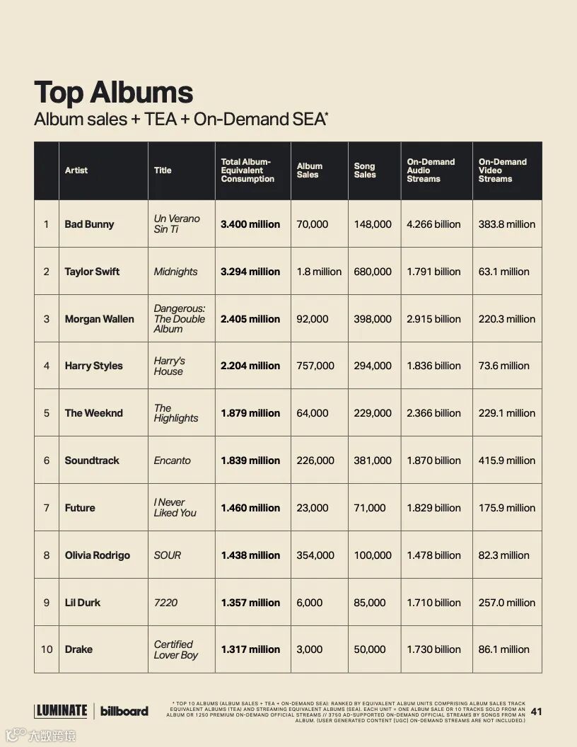 这一年,Taylor Swift、Beyoncé和Bad Bunny的新专辑一经推出就登上了 Billboard 200 排行榜的第一位,但每位艺术家都通过不同的消费组合取得了第一的位置。虽然 Bad Bunny 为他的专辑《Un Verano Sin Ti》提供了 100% 的数字产品,但 Beyoncé 的《Renaissance》的第一周消费数字中只有 55% 来自数字渠道,Taylor Swift的《午夜》的第一周消费数字只有 38%是数字化的。 值得注意的是,Taylor Swift的实体产品——为粉丝提供的多种黑胶唱片和 CD——占 62%。《午夜》在第一周售出了 575,000 张黑胶唱片,打破了 Harry Styles 在 5 月份创下的纪录。