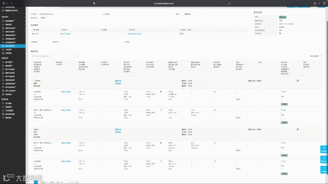 在报价完成后,系统会自动生成比价看板,嘉益电器采购无需做任何数据整理,结合供应商绩效数据、历史价格、历史核价,在线勾选被采用的供应商,便可将结果发布通知相关供应商。