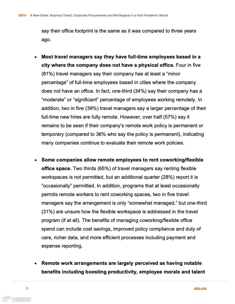 全球商务旅行协会发布了报告“新秩序——大流行后的商务旅行”。大流行影响了员工的工作地点,从而影响了公司办公室的足迹。67%的差旅经理预计员工将在公司完全重新开放办公室时返回,但只有1/10的受访者预计员工将完全远程(10%)或完全在办公室(9%)工作。