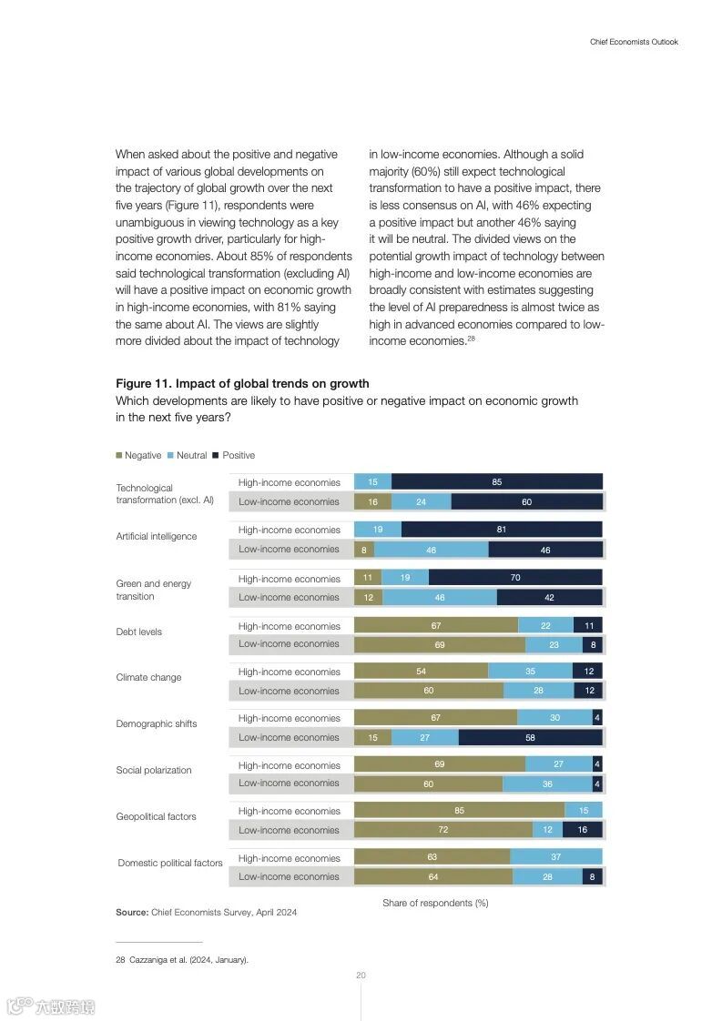8. 全球发展的负面影响:首席经济学家普遍认为地缘政治、国内政治、债务水平、气候变化和社会极化将对高收入和低收入经济体的增长产生负面影响。