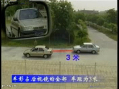 一般情况下,根据驾驶员从本车前部轮廓线看到前车后保险杠及轮胎的位置来判断: