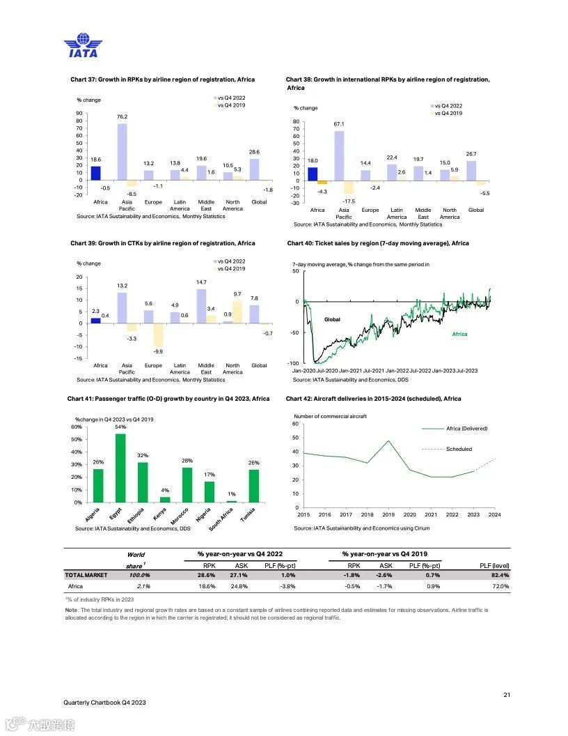 2023年第四季度,北美和拉丁美洲航空公司的总RPK增长强劲,同比分别增长10.5%和13.8%。