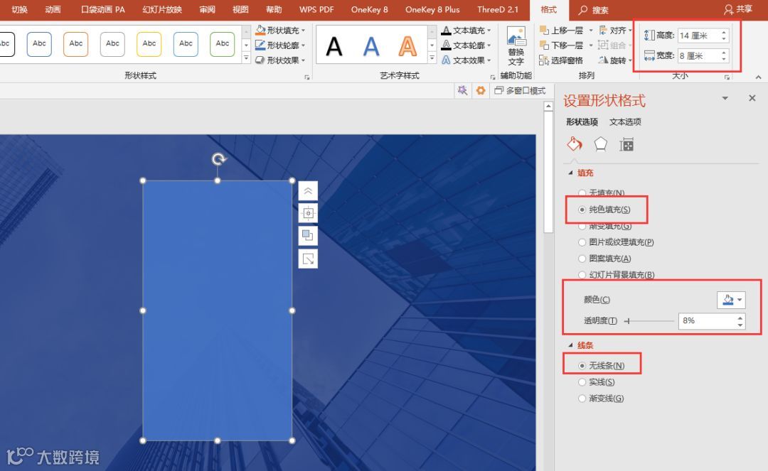 为14厘米,宽度设为8厘米,填充设为纯色填充,颜色使用蓝色填充,透明度设为8%,线条设为无线条。