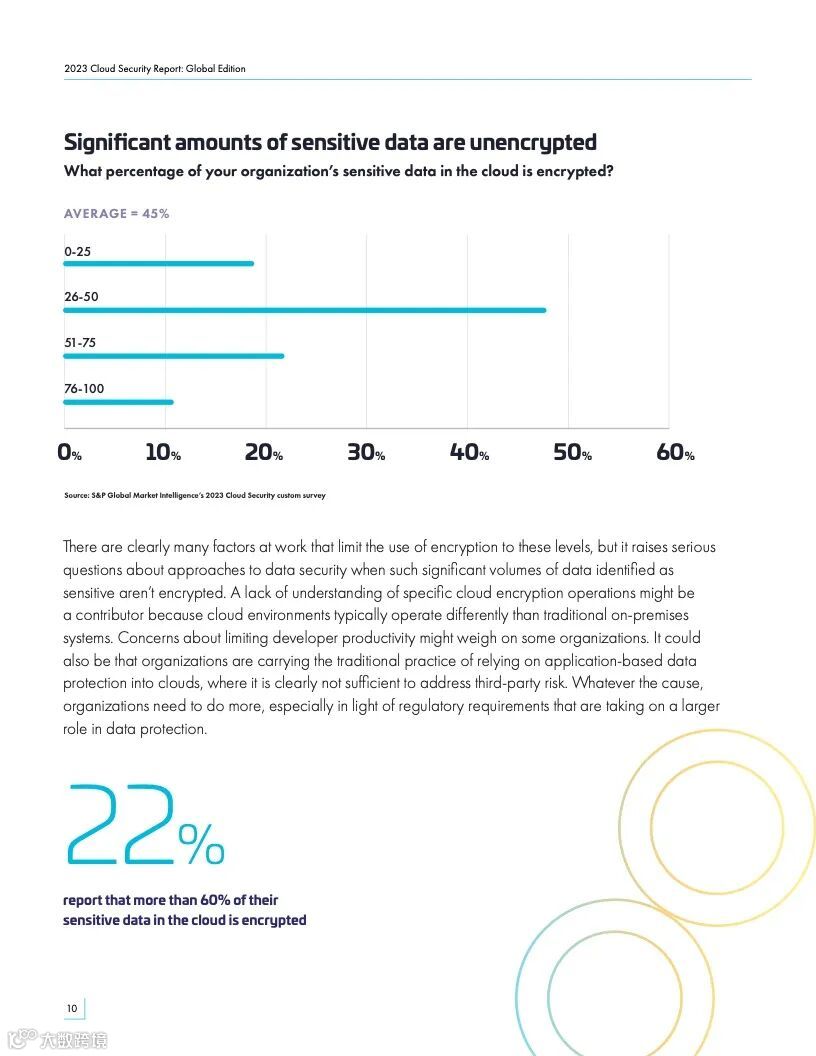 只有22%的受访者表示,他们60%或更多的云数据是加密的。平均而言,只有45%的敏感数据被加密。