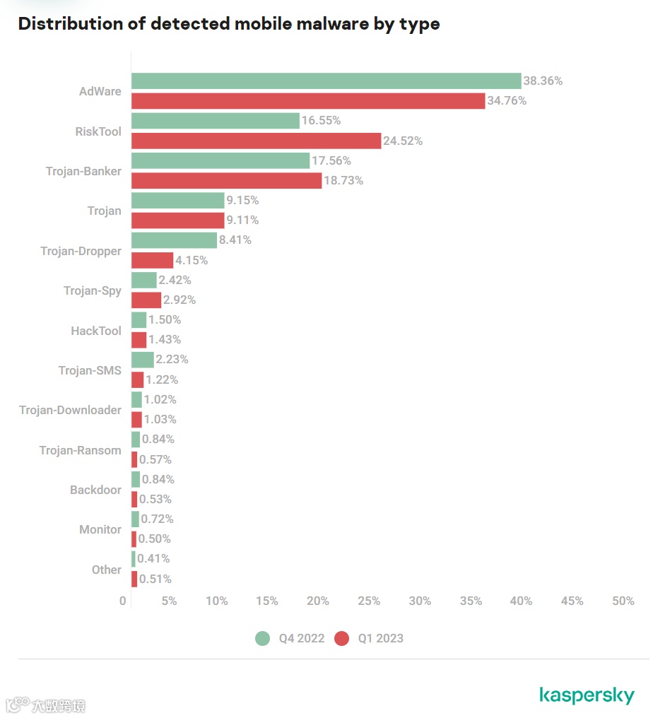 广告软件以34.8%的比例重回榜首。在2023年第一季度,最广泛的广告软件家族是MobiDash (22.5%), HiddenAd(21.9%)和Adlo(12.4%)。
