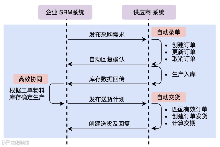 SRM系统协同虽然快速简单,但也存在明显的问题。首当其冲就是供应商可能重复工作的效率问题。现今,大多数供应商企业都已经或多或少的实现了企业内部主要流程的信息化管理。上面说到的订单通过SRM系统下达到供应商后,供应商很可能还需要再将订单转化成其内部需求,再录入到其内部的订单系统中,并在其内部系统实现发货后,再在客户SRM系统中完成送货的相关操作。这里面大部分的工作都是重复的,效率低下。我们同样可以推动与供应商系统对接,完成相关流程的线上数字化协同,增效减负。如下图所示为笔者所在的企业与供应商实现的数字化协同方案。