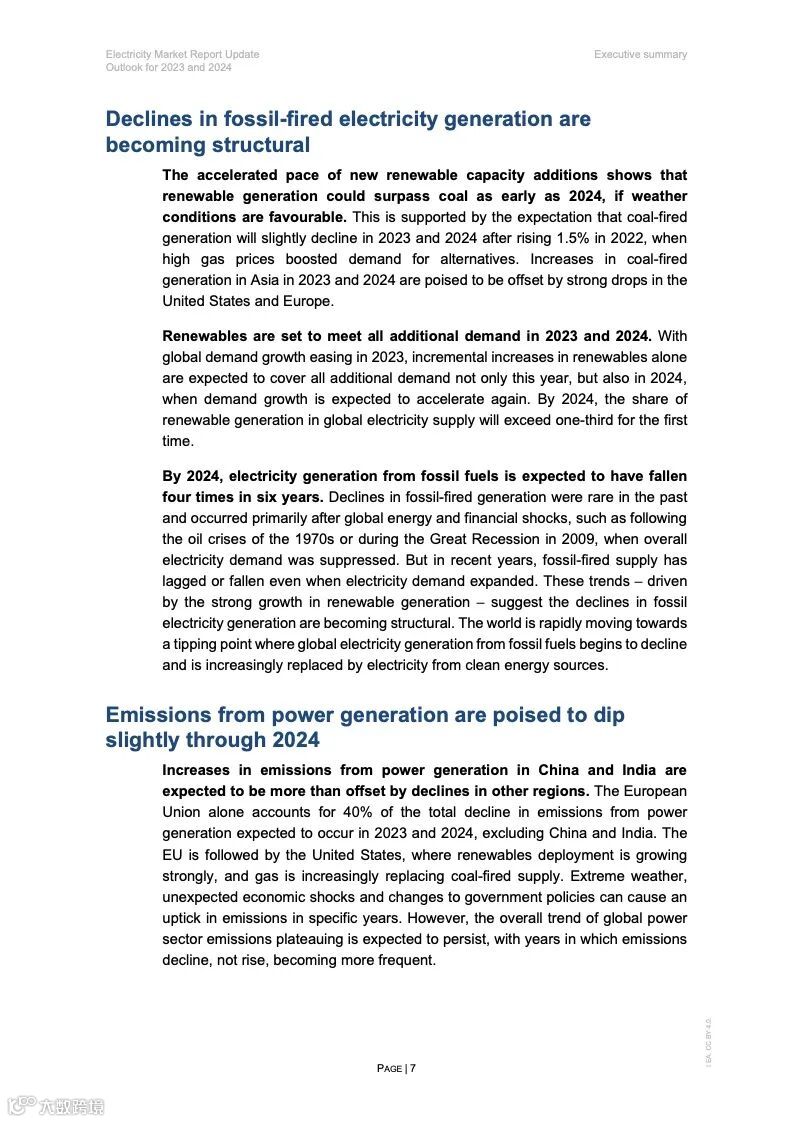 中国和印度发电排放的增加预计将被其他地区排放量的减少所抵消。预计在2023年和2024年(不包括中国和印度),仅欧盟就占发电排放总下降量的40%。紧随其后的是美国,可再生能源的部署正在强劲增长,天然气正在逐渐取代燃煤供应。