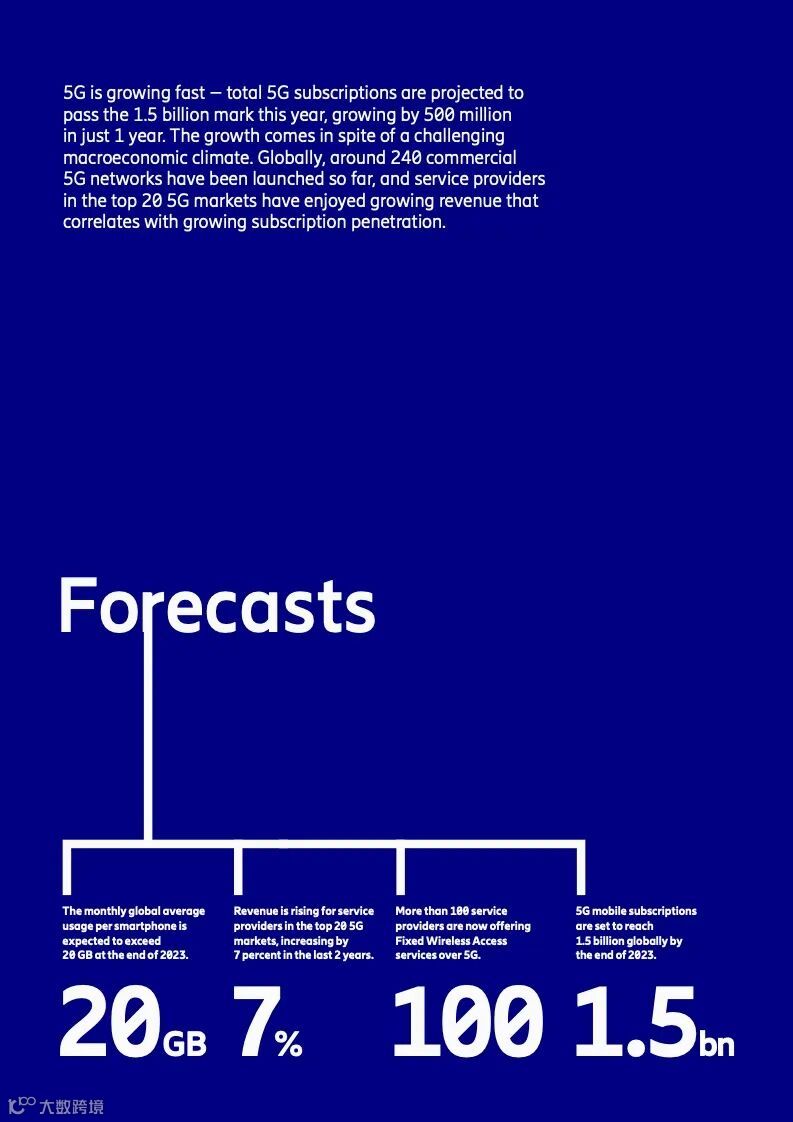 尽管一些市场存在地缘政治挑战和宏观经济放缓,但从根本上说,全球每个地区的5G用户都在增长。全球移动网络数据流量继续增长,预计到2023年底,全球每部智能手机的月平均使用量将超过20GB。