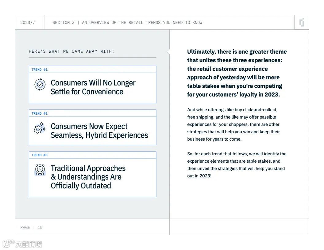 导读:孤立的店内或在线体验的日子已经一去不复返了。消费者将期待在 2023 年将两者无缝融合。以前,点击提货、退货,免费送货等元素被认为是尖端的混合体验,但它们现在是意料之中的。三个消费者中就有一个期望零售