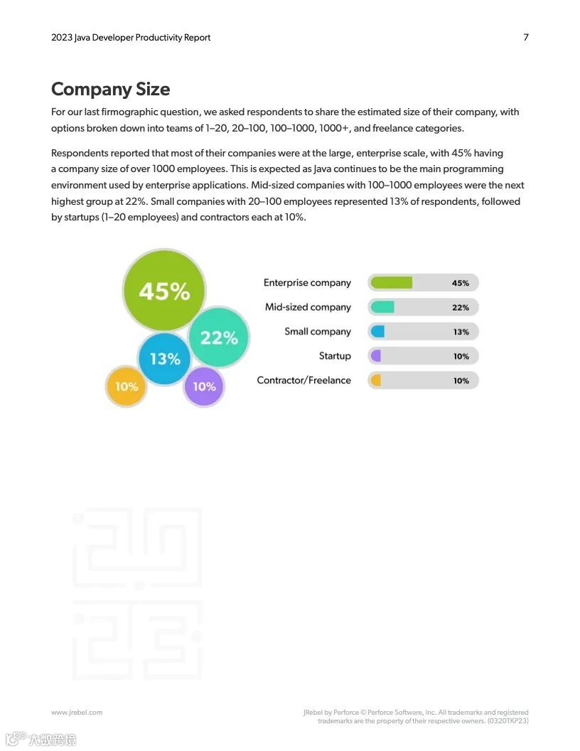 在根据公司规模查看响应时,拥有不到100名员工的公司中,Java 8的使用略高于其他公司,而它们继续显示出对Java 11及更新版本的较高使用率。同时,拥有超过100名员工的公司显示出Java 11和Java 8的使用几乎相等。