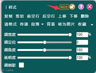 1.点击图片,弹出“样式”工具栏,点“特效”按钮可以更换图片