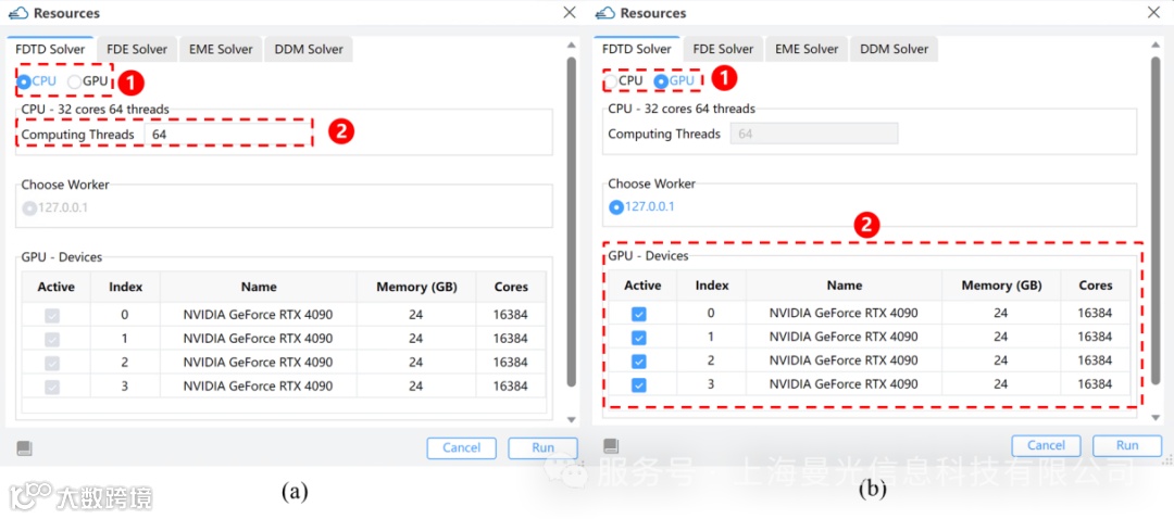 在Max-Optics Studio的FDTD模块中,可选择CPU或GPU来运行仿真,CPU、GPU设置如图19所示。