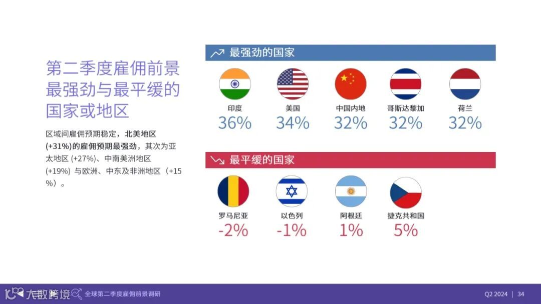 32%中国内地净雇佣前景指数期望增加员工人数的雇主比例减去期望减少员工人数的雇主比例之差。较 去年同期上升了3个百分点,较Q1 2024(+26%)降低了1个百分点。