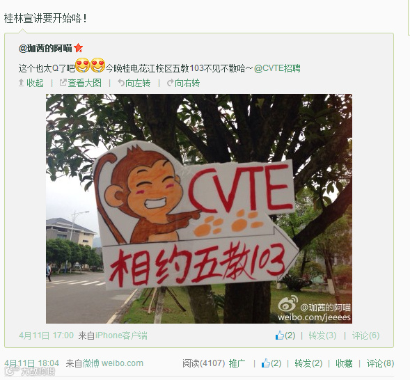 小HR听说桂林最近几周都春雨绵绵,昨天却是晴空万里,是在迎接CVTEr吗?同学们不仅组队去围观CVTE宣讲会,更有热心的小伙伴通过多种渠道与身边伙伴分享了他们看到的宣讲会: