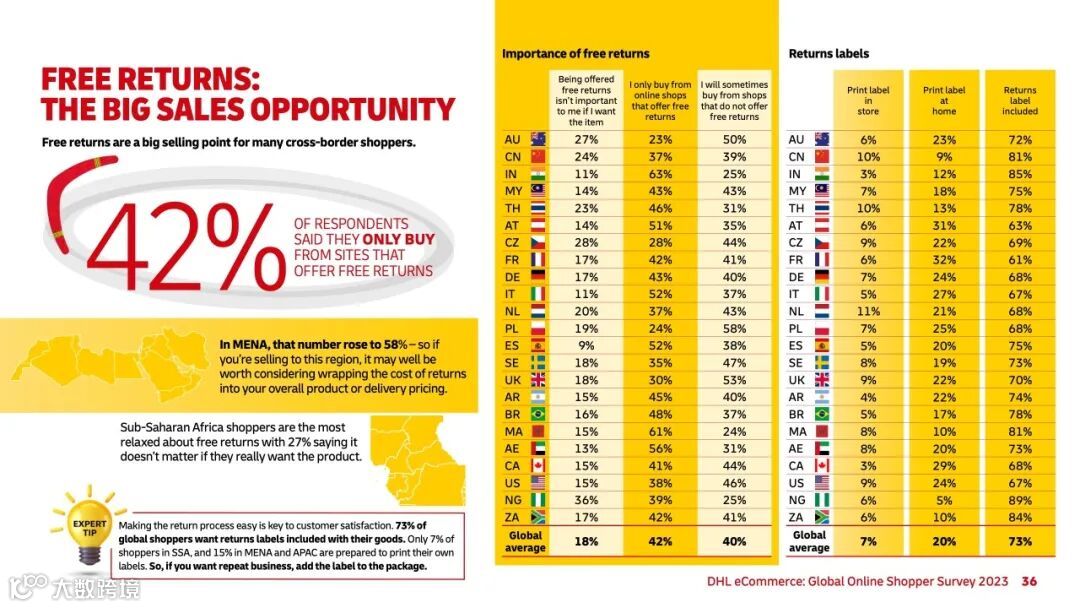 DHL发布了“2023年全球网购消费者调查”。这项调查涵盖23个市场的11500名网购者。结果显示,全球大多数网购者(55%)都乐于跨境购物。北美是最不可能从其他国家购买的地区(45%),美国尤其落后。