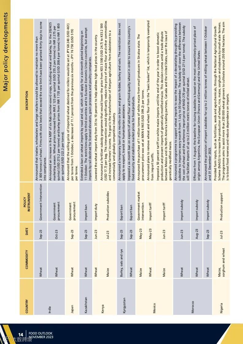 联合国粮食及农业组织发布了“2023年下半年全球粮食市场报告”。最新预测显示,大多数基本食品的生产前景良好。全球粮食生产系统仍然容易受到极端天气事件、地缘政治紧张局势加剧和政策变化带来的风险的影响,可能会打破脆弱的供需平衡,并削弱国际粮食商品贸易和全球粮食安全的前景。