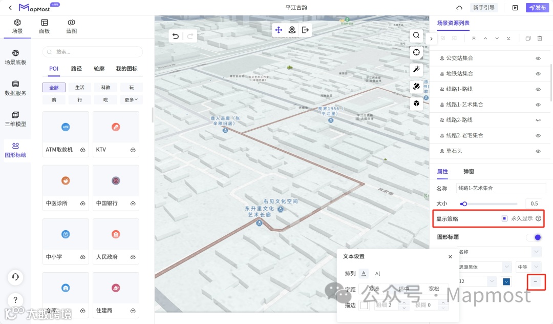 扩展POI标题的文本样式配置:选中POI后点击属性栏-标题选项中的三个点进行文字排列、字距等设置;新增POI显示策略配置:取消勾选永久显示,当附近点位信息呈现拥挤时,会自动隐藏此要素。