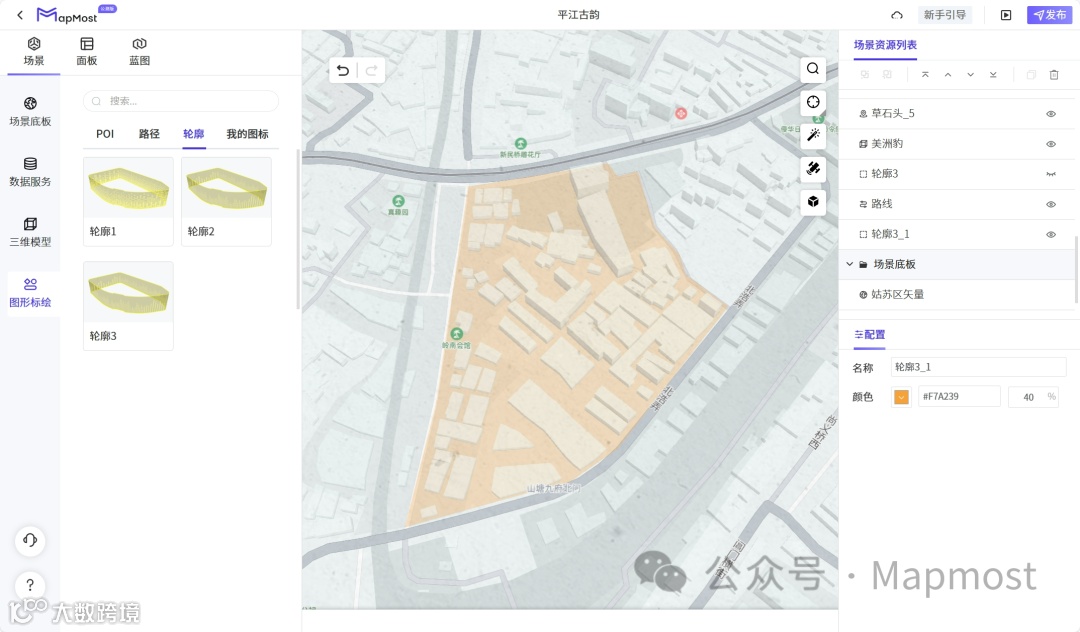 路径、轮廓样式上新:新增可多样式切换的二维路径以及可绘制面积的轮廓。可以在【场景】-【图形标绘】中体验使用。