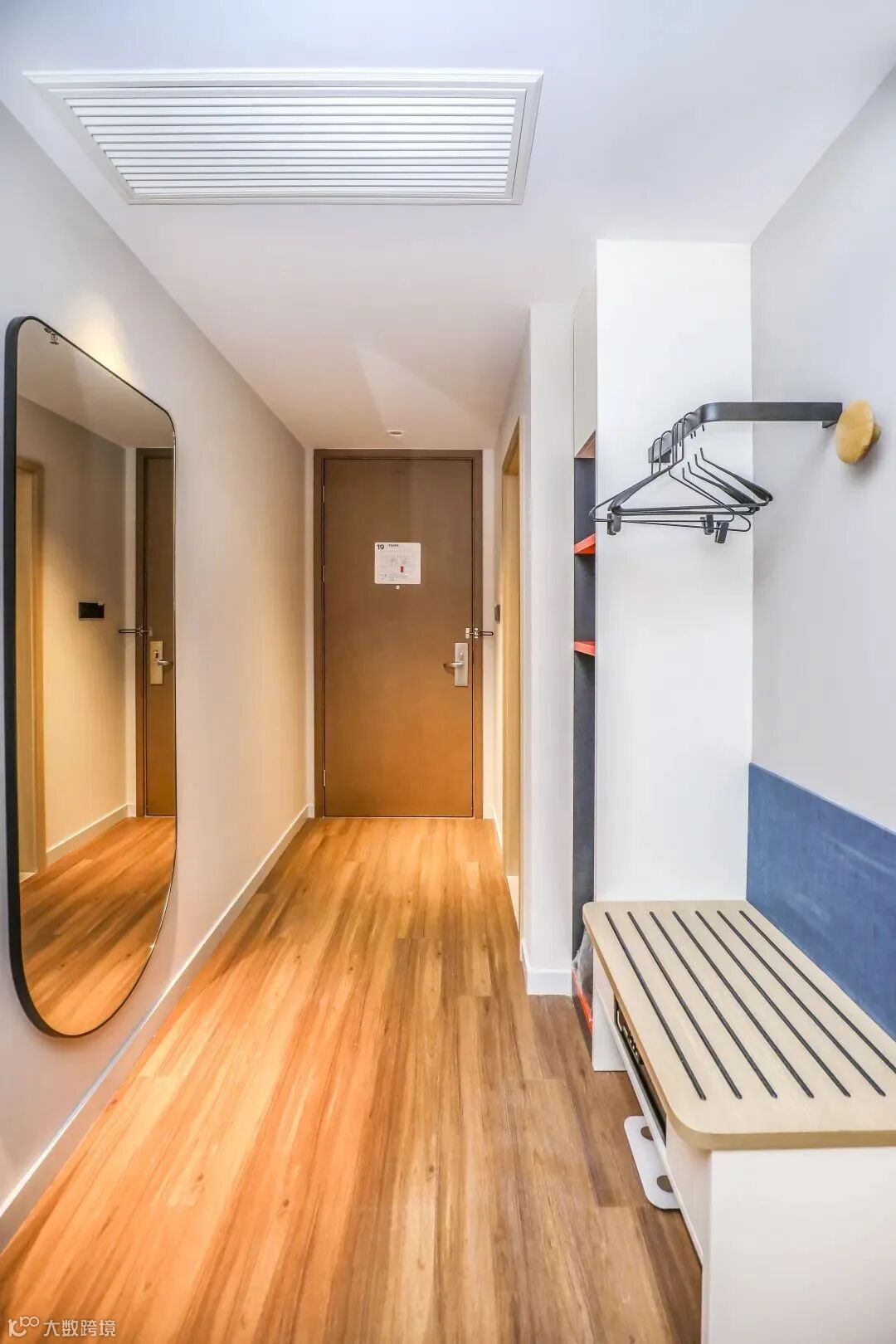 原木色的墙壁,和极具质感的地板,纹理和色调的结合是内部的主旋律。沉稳色系散发优雅温润的空间氛围,不失质感,公共空间融合头门港特有的集装箱元素以蓝白灰色系表达,结合干净的线条给人带来高贵宁静的视觉感受。