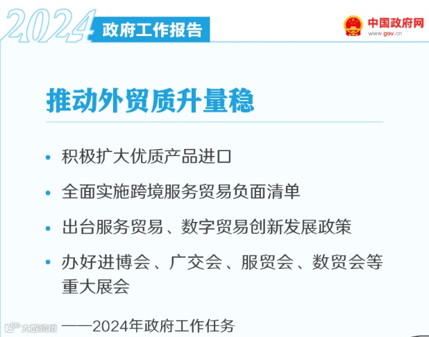 在2024年政府工作报告中提出,要推动外贸质升量稳,办好进博会、广交会、服贸会、数贸会等重大展会。